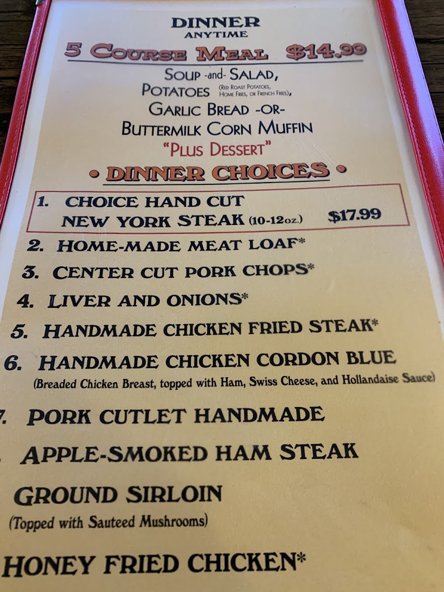 For lunch, the menu features familiar sandwiches such as grilled cheese with fries, meatloaf, and Texas chili cheese burgers with a side of fresh fruit. Comforting choices like country fried steak and classic sides like biscuits and gravy or home fries round out the offerings, keeping the tone simple and satisfying throughout the day.